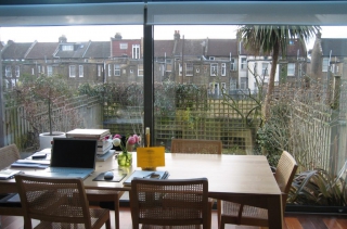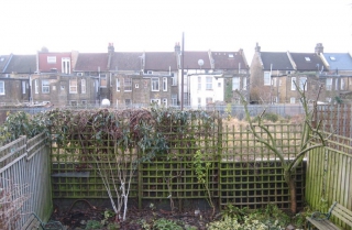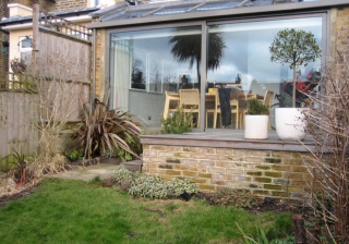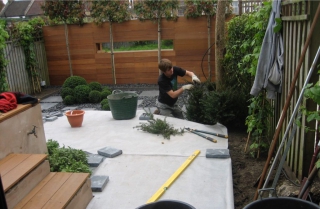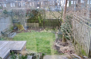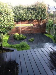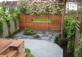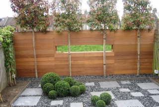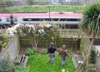 A very low maintenance garden. One of the elements I designed was a wooden wall to absorb much of the sound of the passing trains. I left a rectangular opening in the wall, (inspired by the idea of wistfully gazing out of a train carriage window) so the green verge opposite would be highlighted while the train line would not. By using top hedging, I was able to obscure the houses opposite and unite the green verge visually.